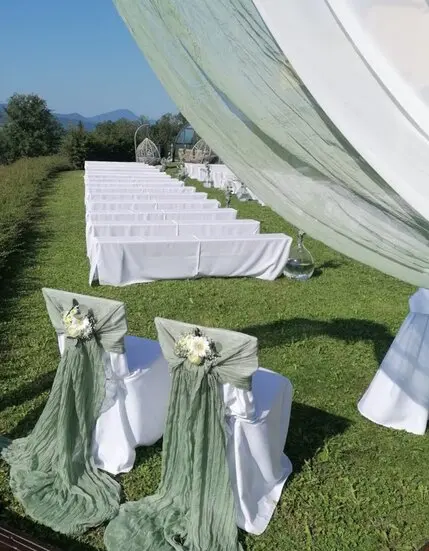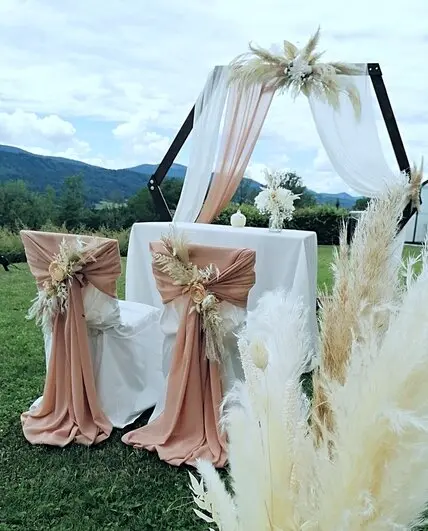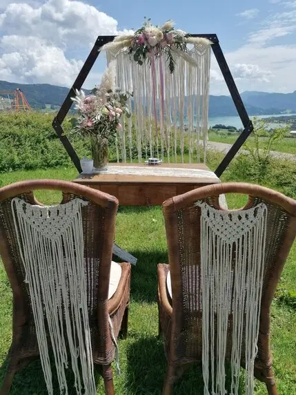 Gemeinsam mit euch entwickle ich ein stimmiges Dekorationskonzept für eure freie Trauung. Bei mir könnt ihr Hussen, Traubögen und viele weitere Dekorationselemente mieten und nach euren Vorstellungen selbst gestalten.